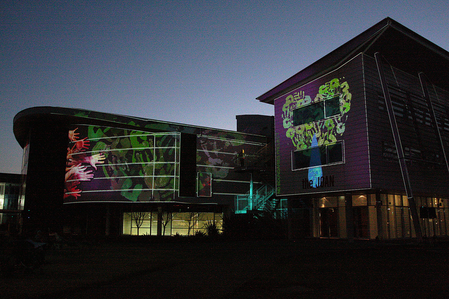 The many faces of the Joan Sutherland Performing Arts Centre, transformed with light and projection during the audiovisual show. Photo by Lenore Betteridge.